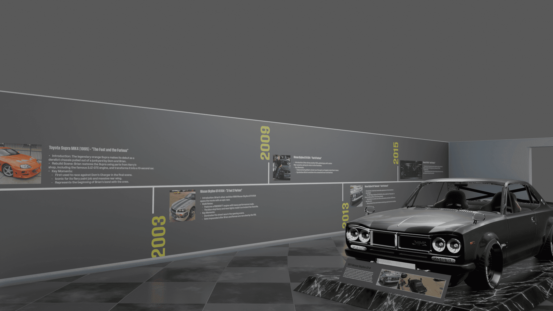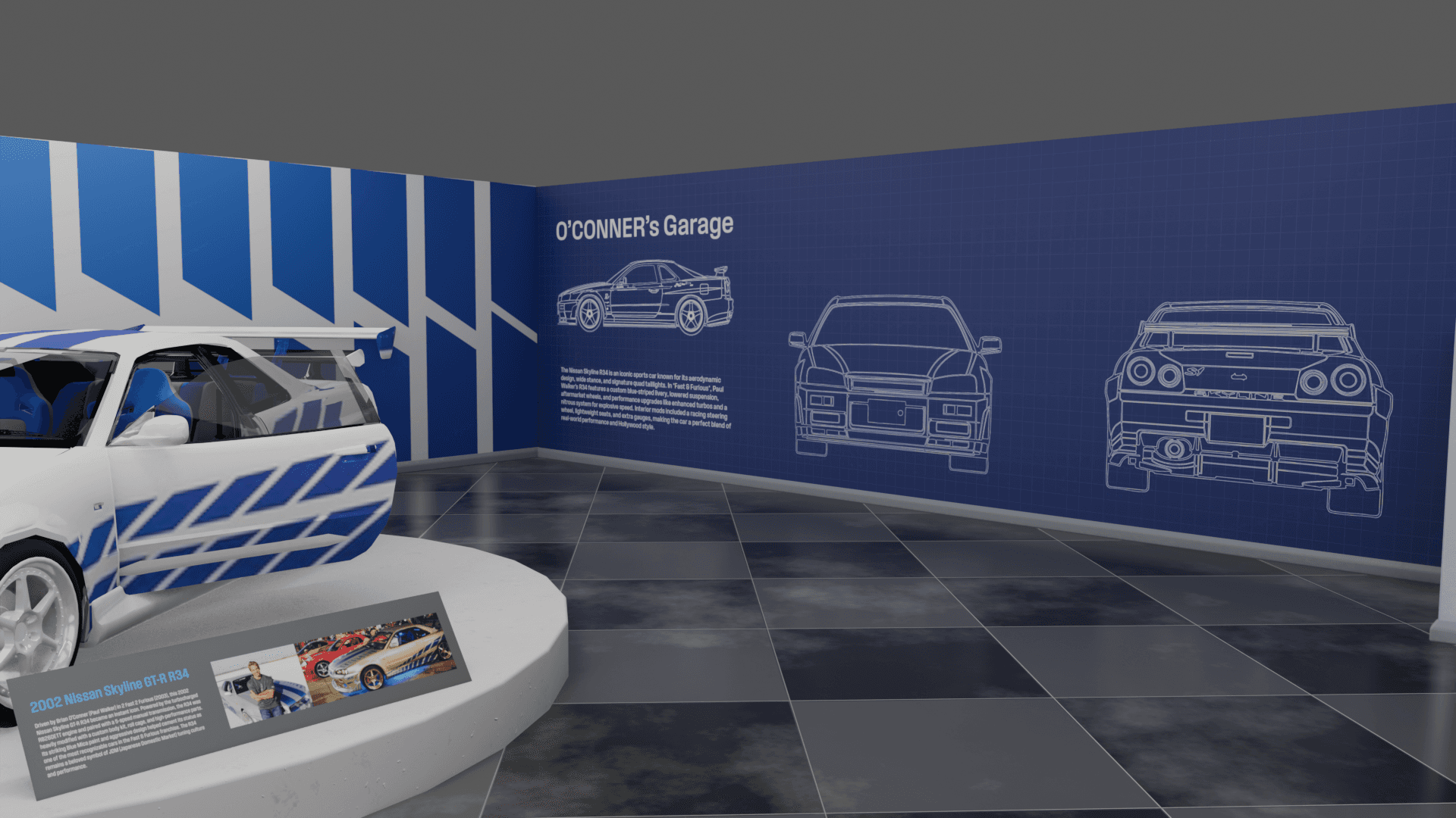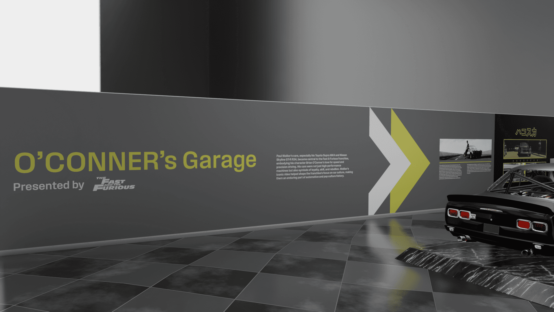 O’Conner’s Garage is a museum experience that explores iconic cars from the Fast & Furious timeline alongside their real-world history. Designed as a temporary exhibit for the Petersen Automotive Museum in Los Angeles, the project highlights the cultural impact and mechanical evolution of these vehicles. With the help of Kenneth Hankish and Oliver Larsen, we developed the layout and accompanying collateral to bring the exhibit to life.