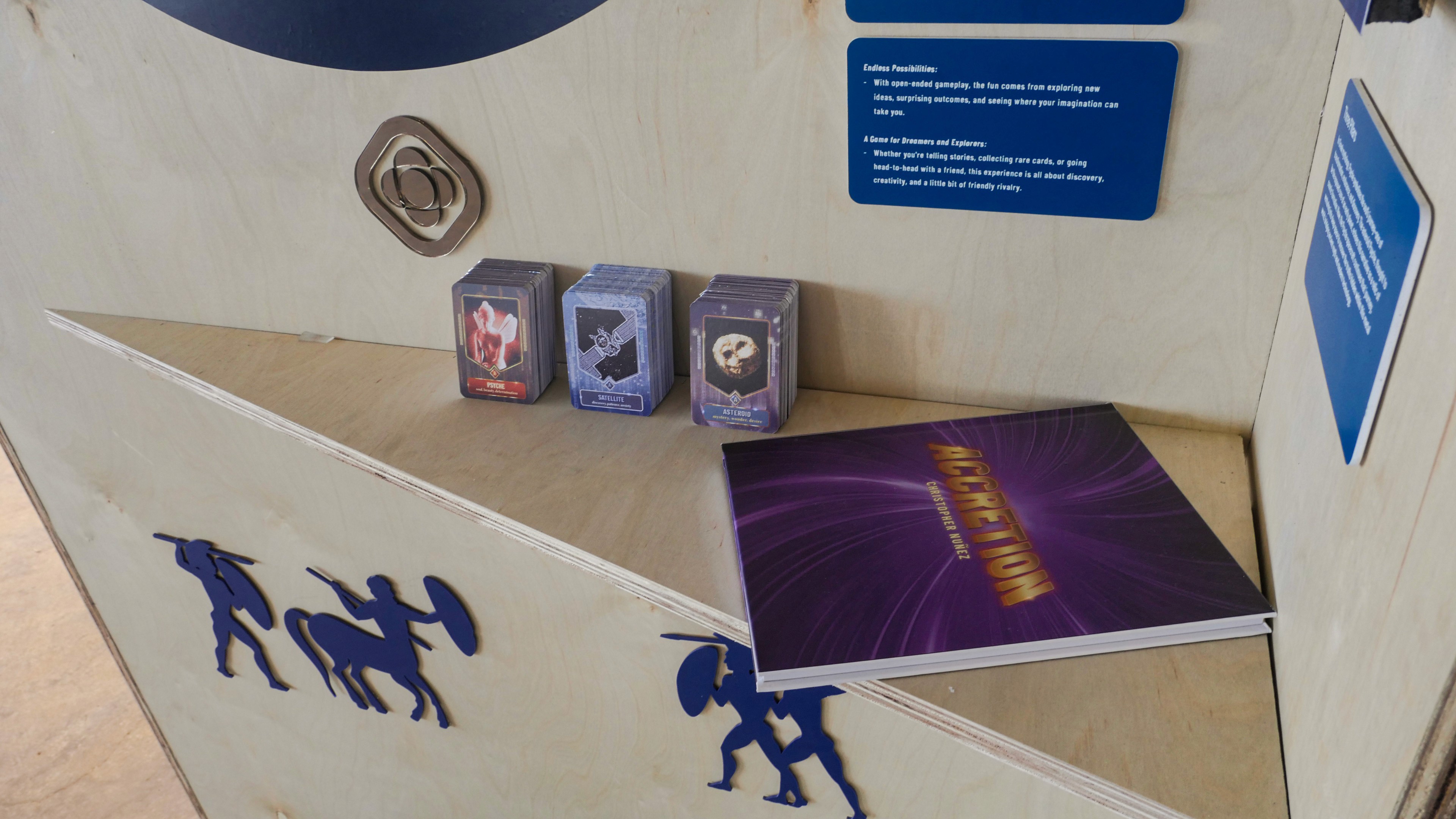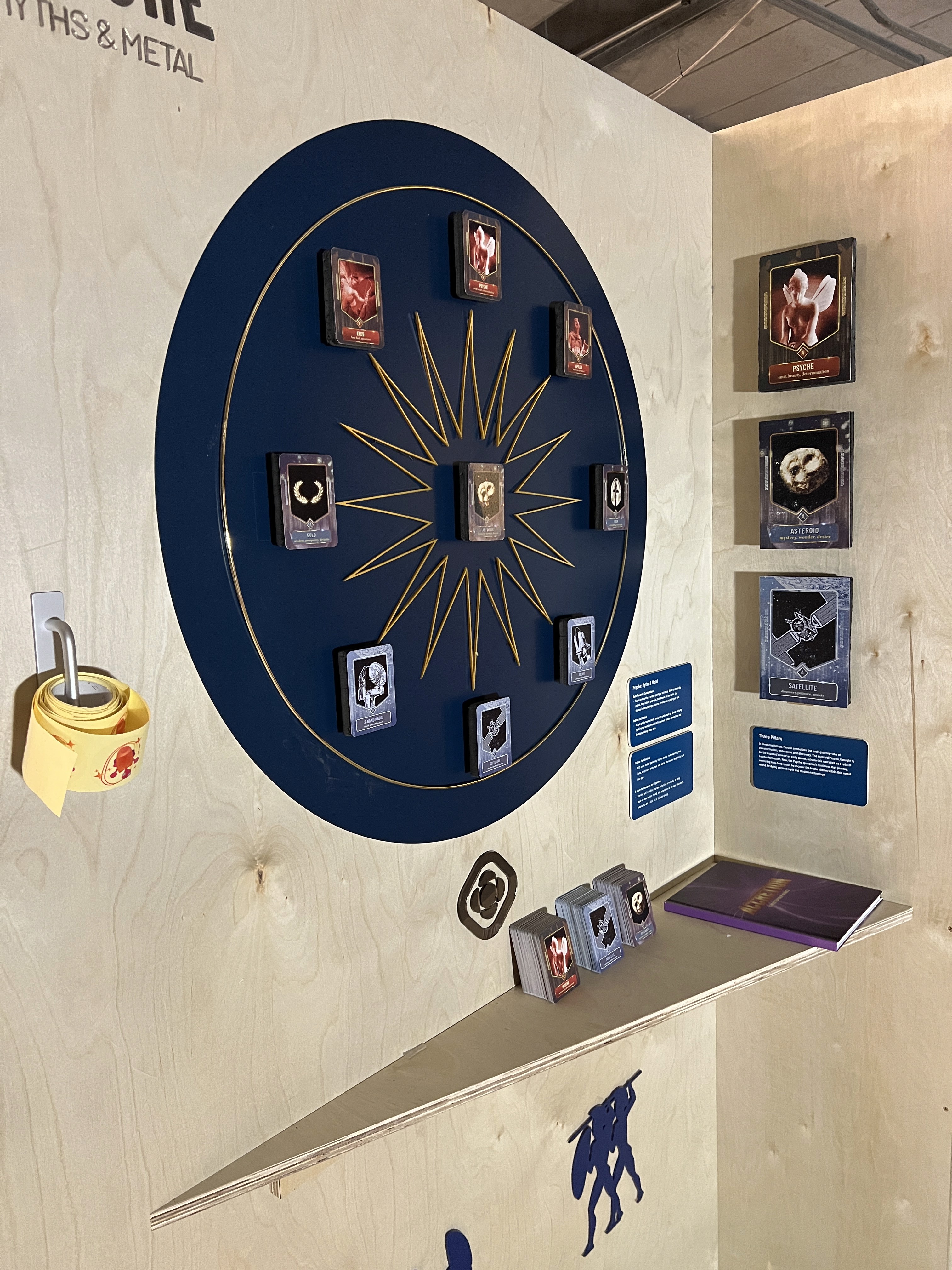 To help spark public interest in the Psyche Mission, I created a set of collectible cards that explore human evolution—from the mythology behind the asteroid’s name to the technology guiding our discoveries. Designed for young adults, collectors, and kids, the game taps into the resurgence of trading cards as an open-ended storytelling tool. Players select words from each card to craft their own narratives about the mission and its potential planetary core. The accompanying exhibition reflects the past, present, and future of Psyche. Cards are arranged in a circular pattern to represent unity, with a starburst layout radiating from the center to symbolize expanding connection and discovery. At the heart is the asteroid card—acting as the origin point of both the game and the mission. The burst echoes cosmic creation events like the Big Bang, representing how Psyche may offer clues to the birth of planets. The layout draws from sacred geometry to connect myth, science, and our place in the universe.